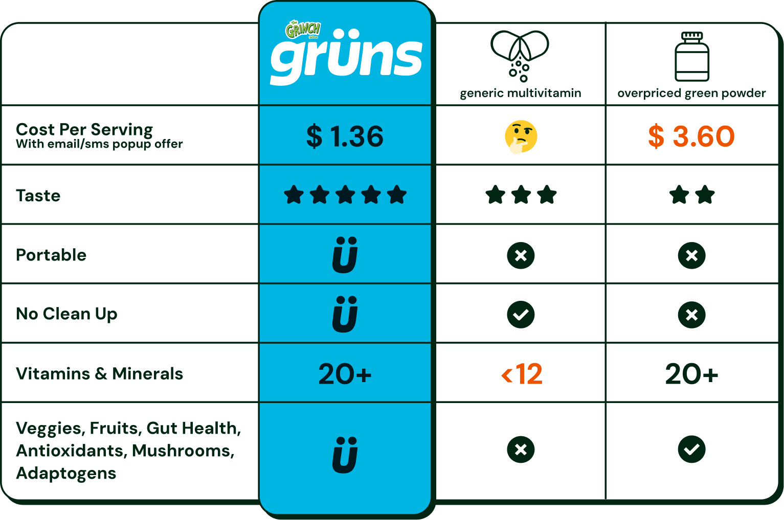 Comprehensive: Nutrition that works. Grüns replaces handfuls of health products at a fraction of the cost.