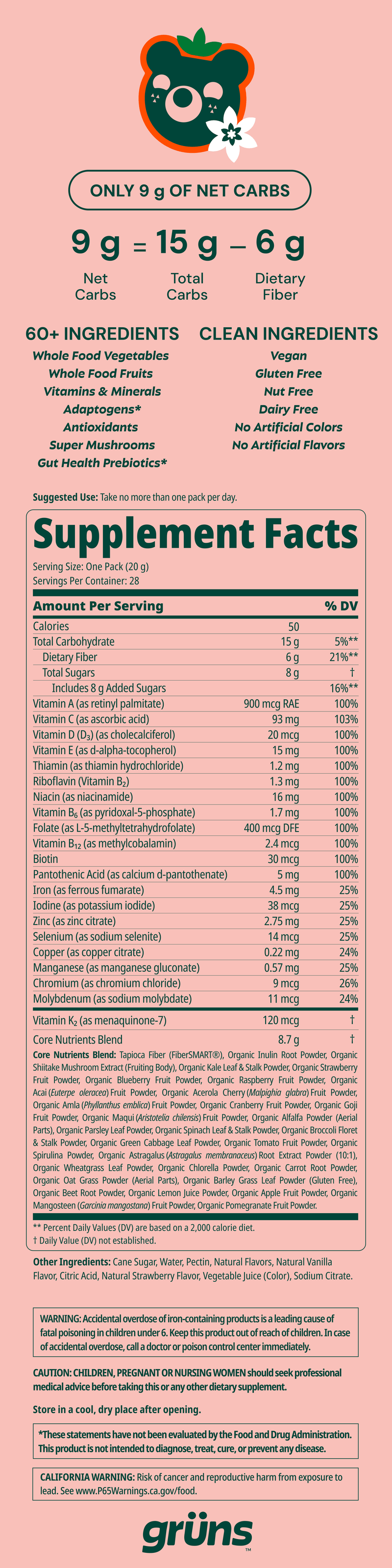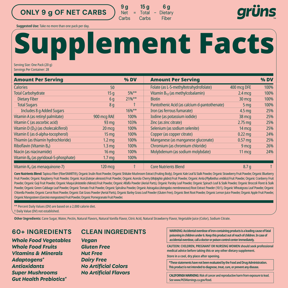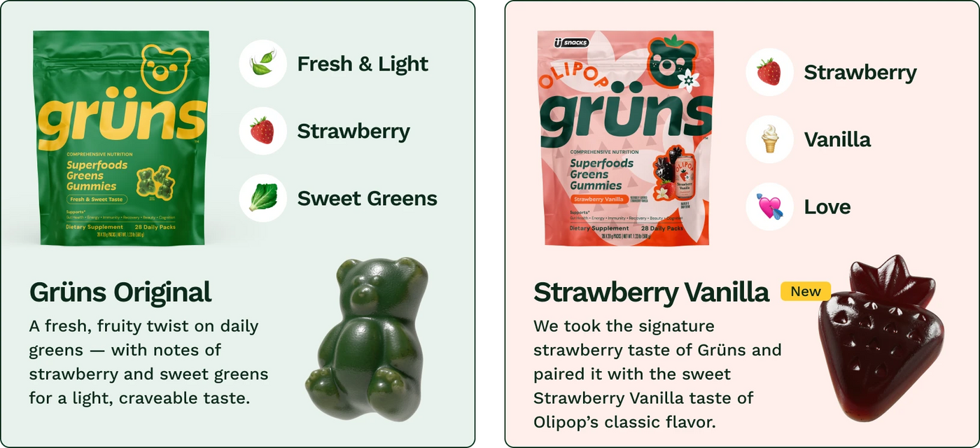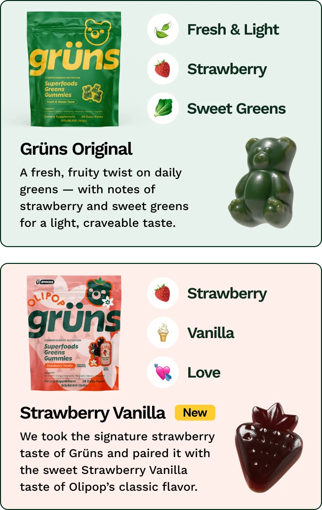 No? Try Grüns Now →We joined forces with OLIPOP® to bring their fan-favorite Strawberry Vanilla flavor into your daily Grüns. Bright strawberry and creamy vanilla. Same greens you know — new flavor worth trying. 🍓