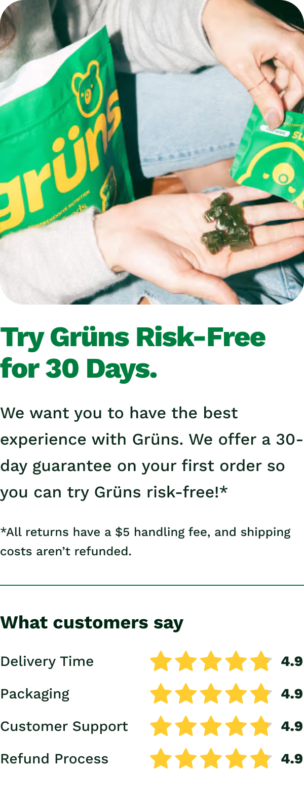 We want you to have the best experience with Grüns. We offer a simple 30-day guarantee on your first order. Refunds include the full value of your order (less a $5 handling fee and original shipping costs), and exchanges are free. We accept all refund requests within our policy with no hassle. If you have any questions about our guarantee, our Grüns Care Bears are always happy to help at care@gruns.co. This policy applies only to your initial purchase.